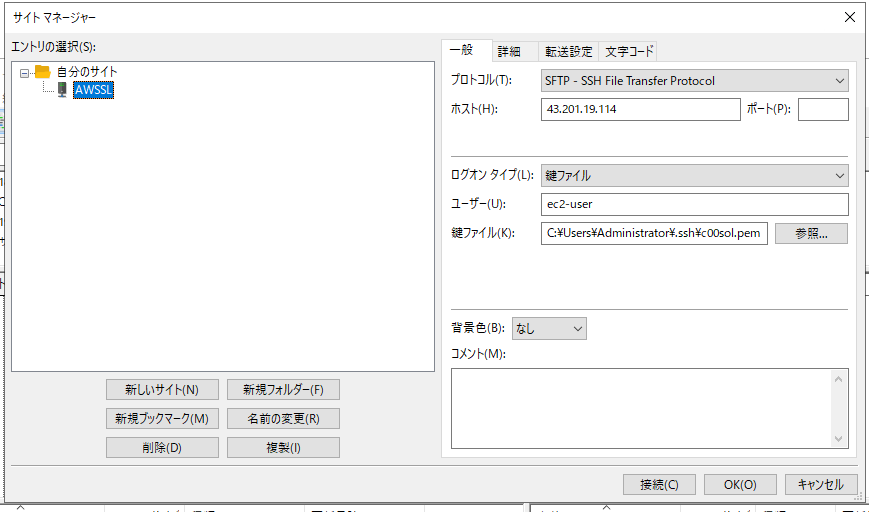 | 鍵ファイル | Lightsail や EC2 の .pem ファイルを選択 |