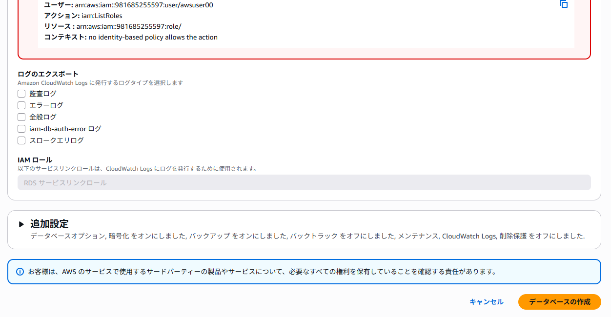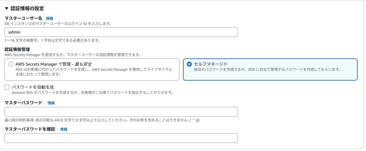 mydb.abc123xyz.ap-northeast-1.rds.amazonaws.com - ユーザー名: